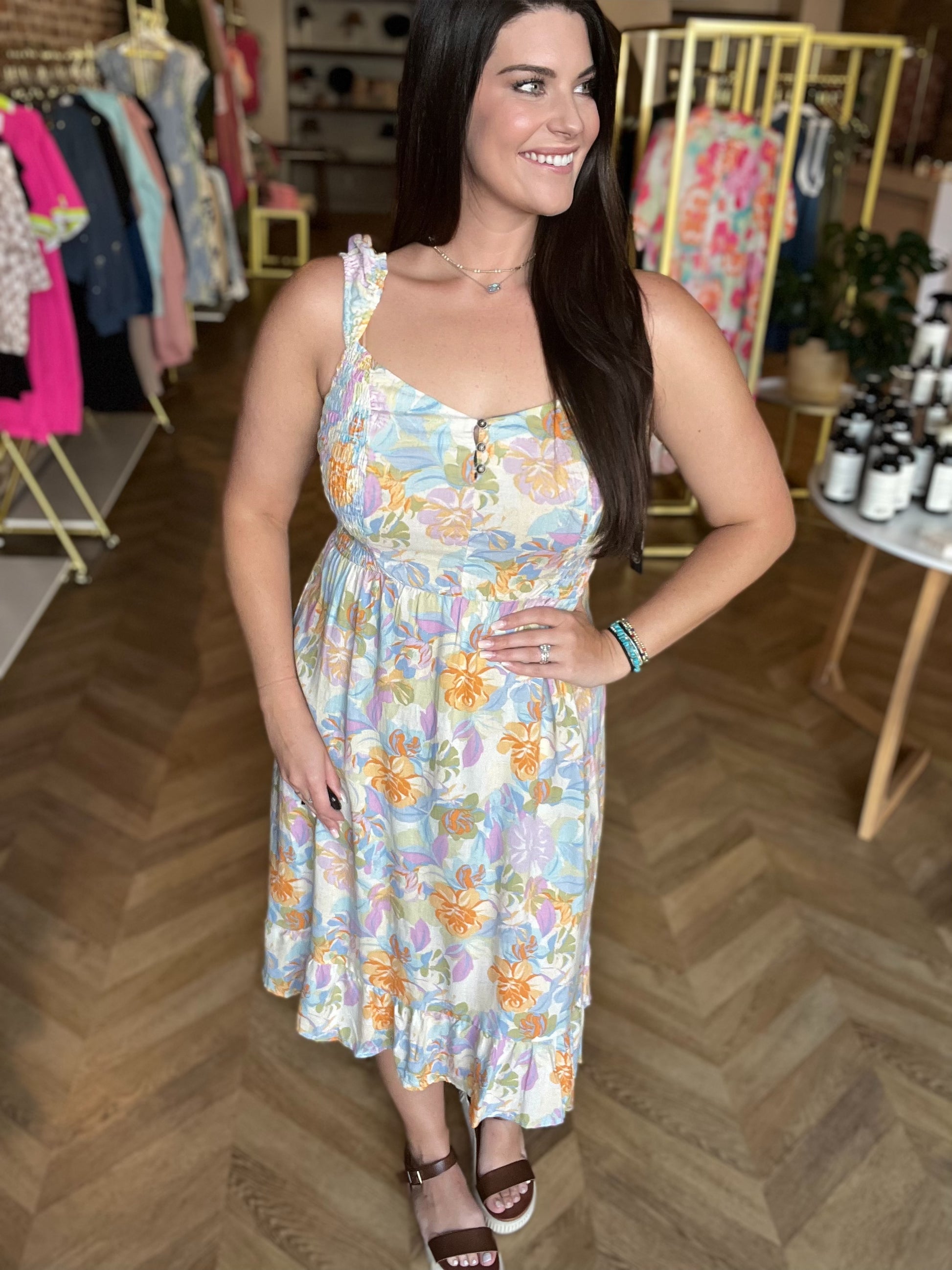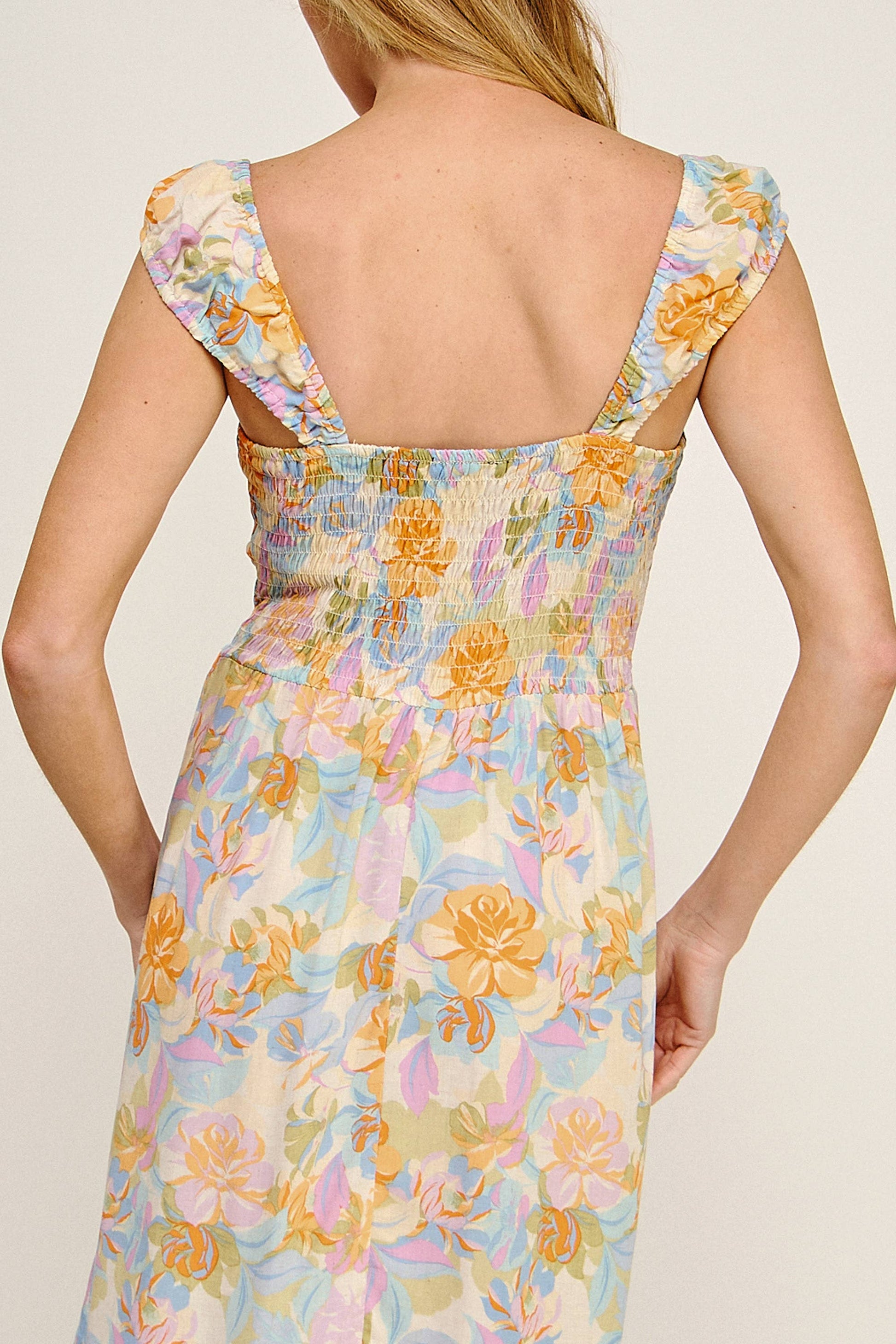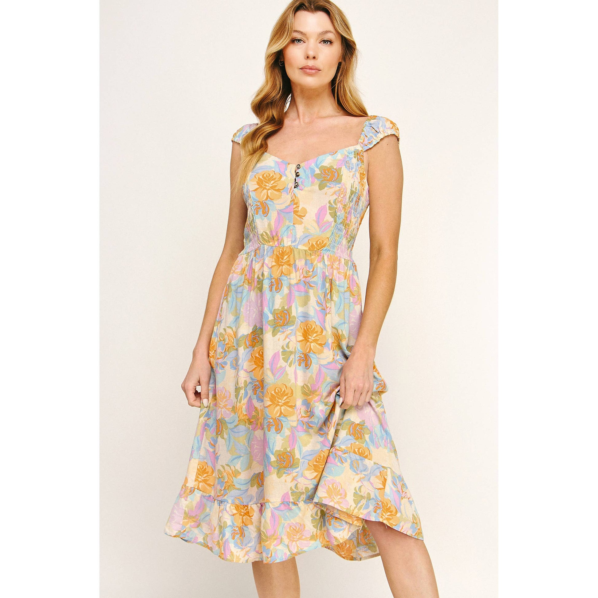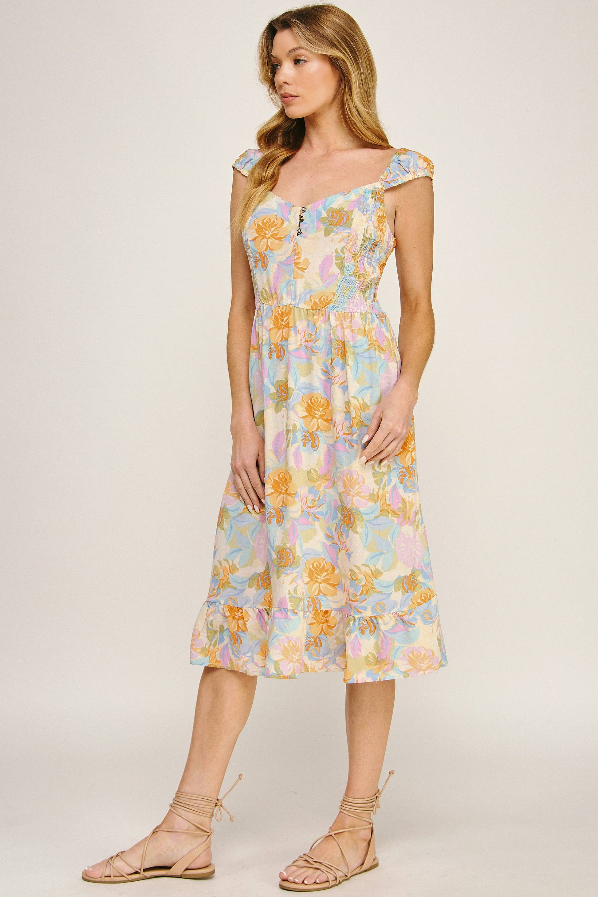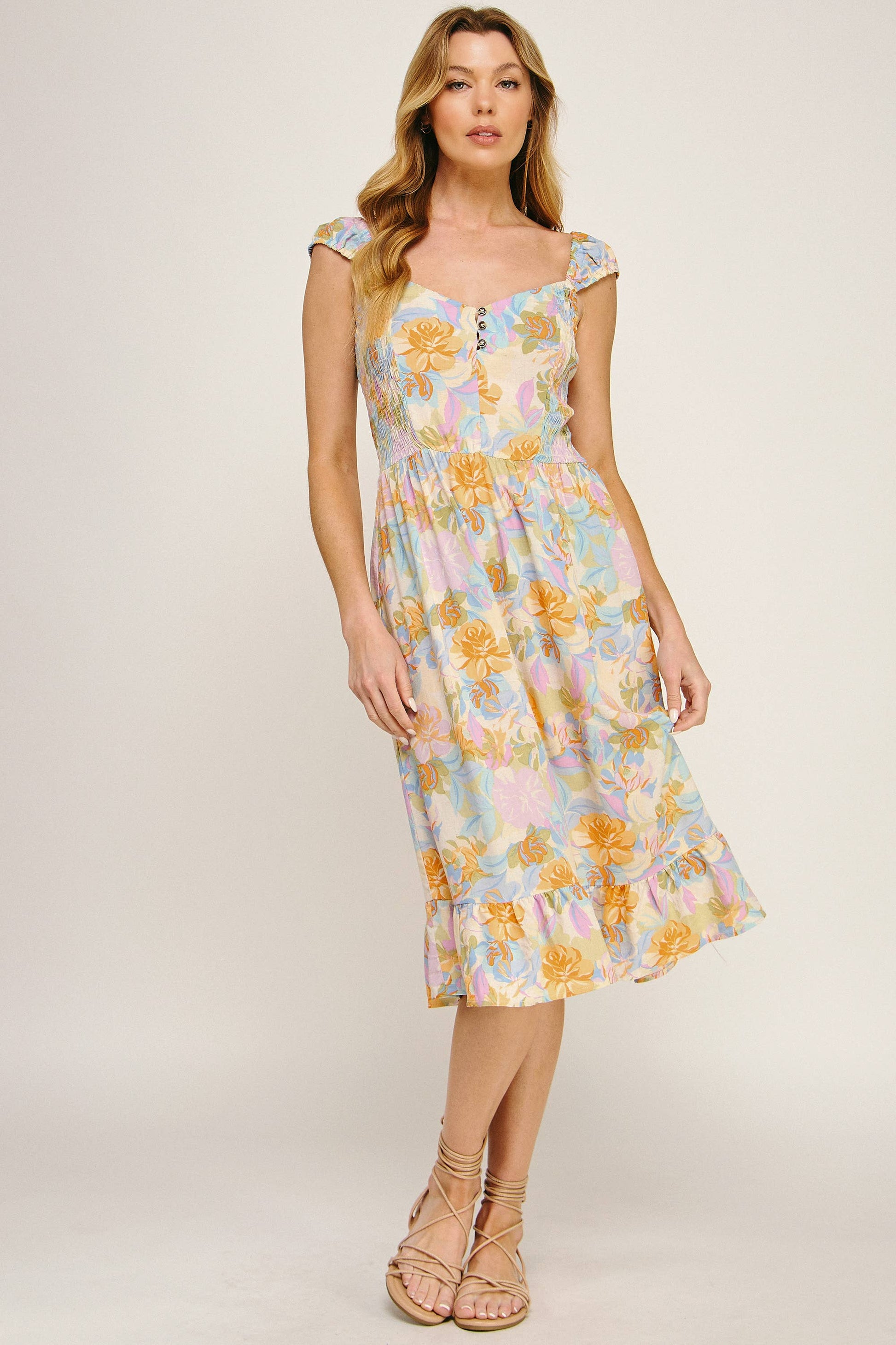 Romantic, breezy, and full of charm—the Sunset Garden Midi Dress is made for golden hour strolls and sunny day adventures. This floral beauty features soft pastel tones with golden blooms on a lightweight, flowy fabric. Designed with a sweetheart neckline, delicate ruffle straps, and a smocked back for a flattering fit, it moves effortlessly with every step.