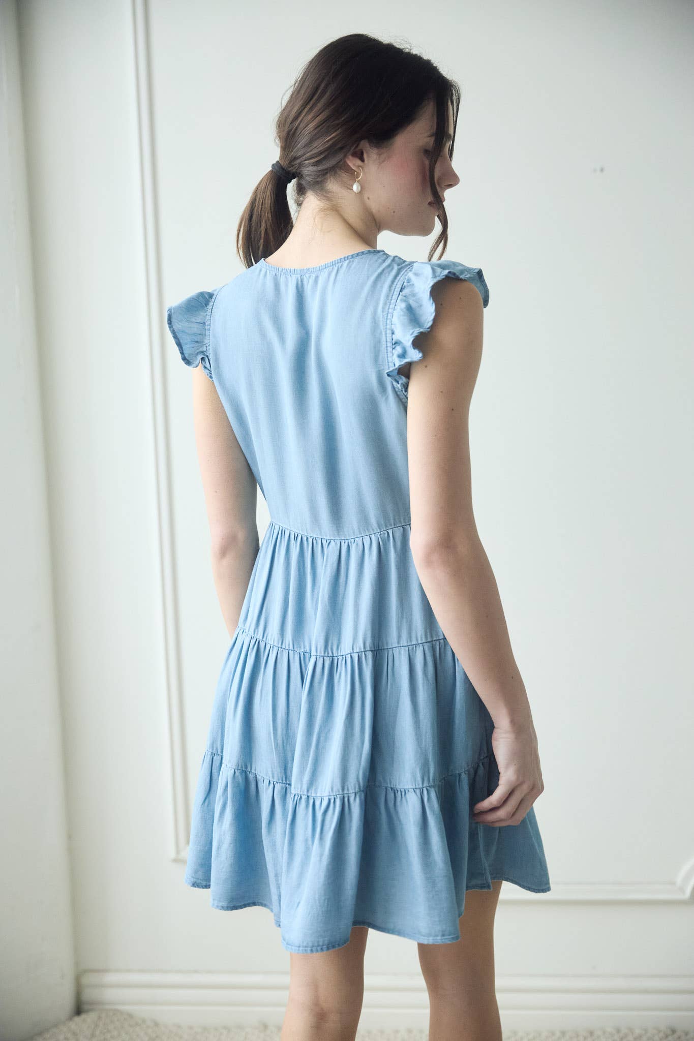 Flirty, feminine, and effortlessly flattering—this chambray dress is a summertime staple. It features a soft V-neckline, tiered skirt, flutter sleeves, and functional tortoise-style buttons down the front. Crafted from breathable lyocell fabric, it offers the perfect lightweight feel for warm days. Dress it up with boots or keep it casual with sneakers or sandals—either way, it’s made for twirling through sunny days in style.