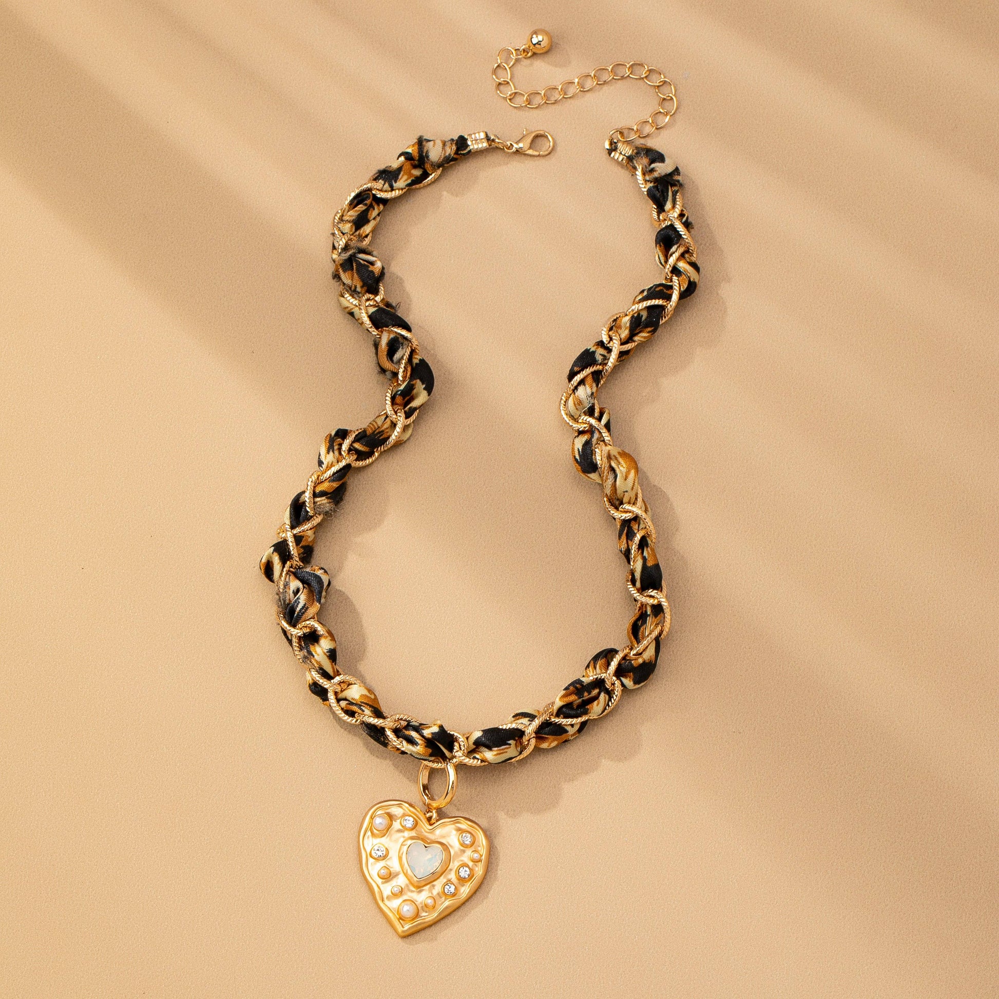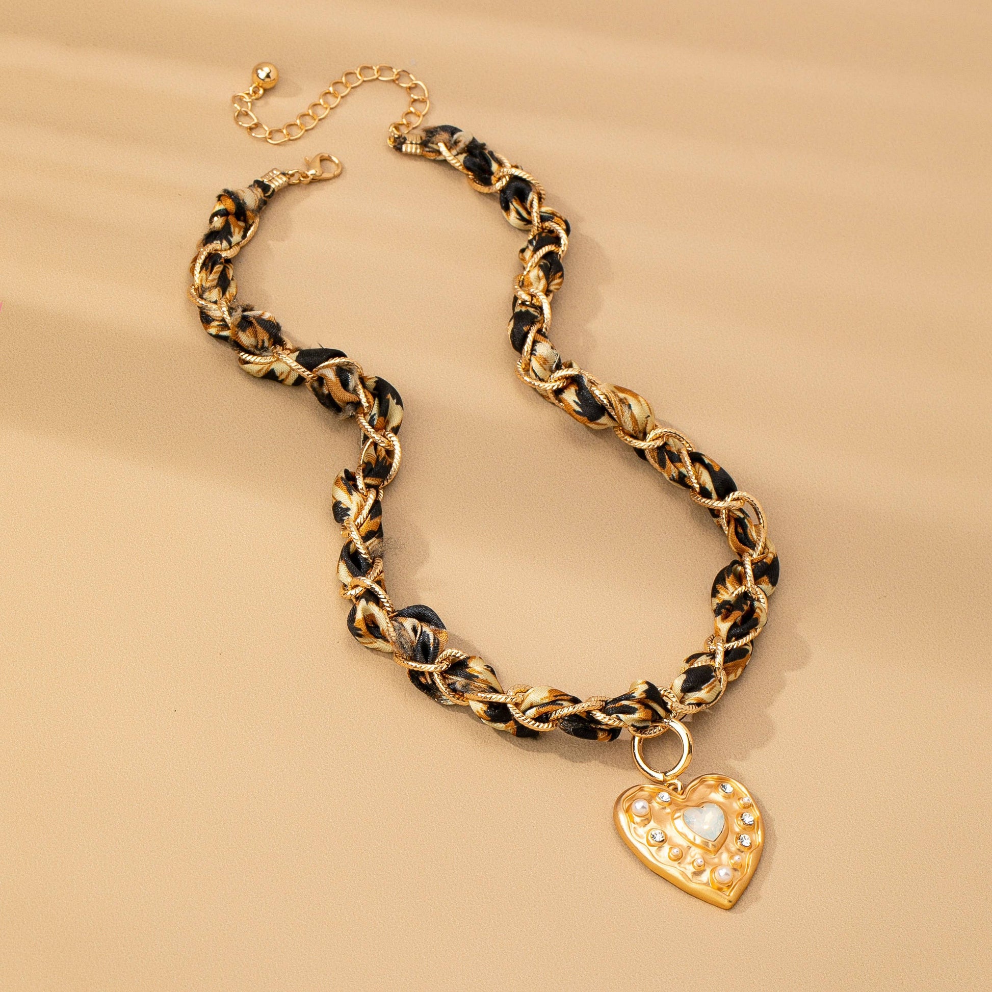 Featuring a luxurious gold-tone chain intricately woven with leopard print fabric, removable gold embossed heart pendant with rhinestones and pearl that adds a subtle romantic touch. Heart charm can be removable. Perfect gift for the holidays, including Christmas, Mother's Day, Valentine's Day.