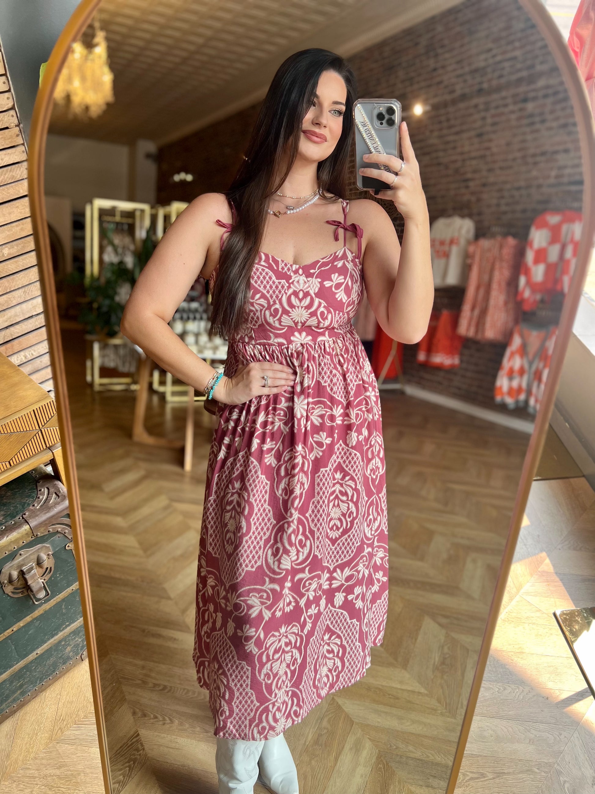 SWEETHEART NECKLINE SLEEVELESS ADJUSTABLE SPAGHETTI STRAP BOW DETAIL BACK SMOCKING A-LINE FLORAL DAMASK PATTERN MIDI DRESS LINED