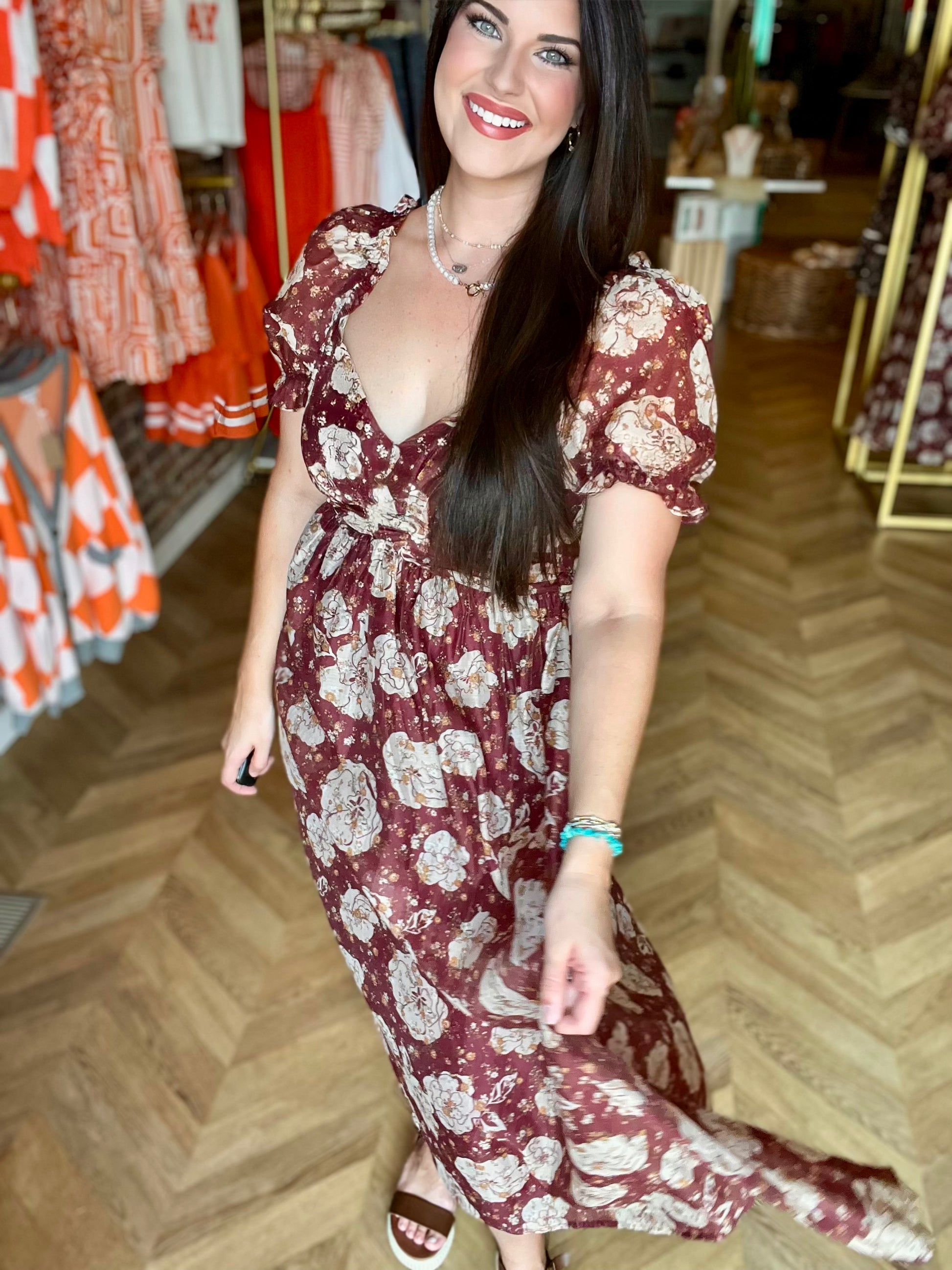 SWEETHEART NECKLINE SHORT PUFF SLEEVES BACK WAIST TIE SMOCKED BACK A-LINE FLORAL PATTERN LINED MIDI DRESS