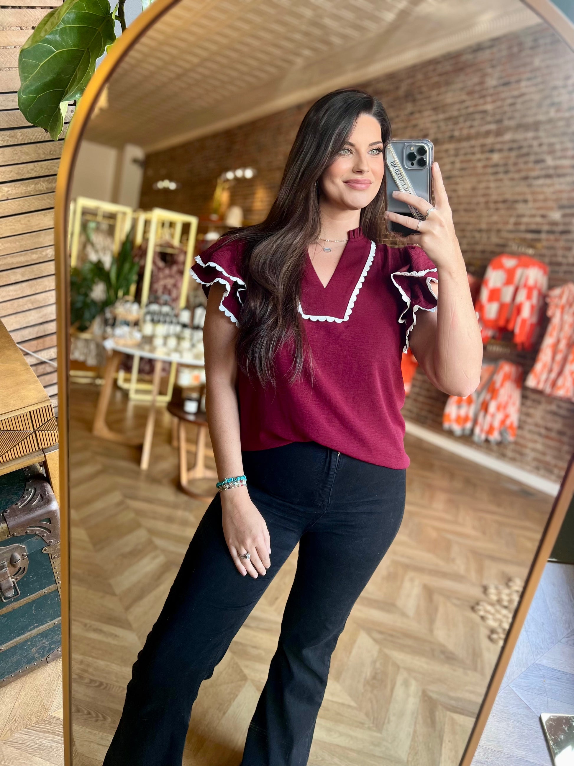This playful and feminine top is a perfect choice for your next game day look. Featuring bold double-layered ruffle sleeves with contrast scallop trim and a flattering V-neckline, this relaxed-fit blouse adds a fun twist to team spirit style. Pair it with your favorite denim or shorts for an effortless outfit that keeps you comfortable and cute all day.