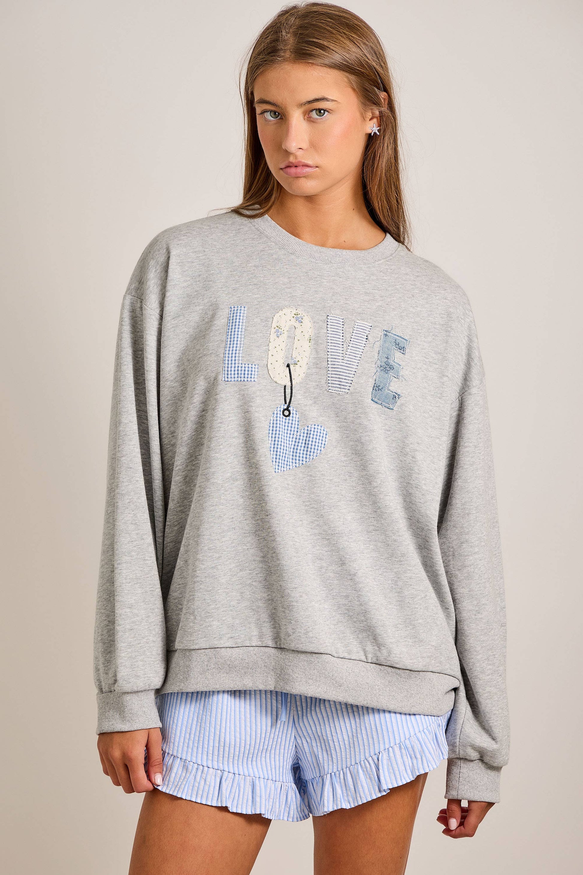 Spread love this spring with our Patchwork “LOVE” Sweatshirt. Featuring playful appliqué letters and a gingham heart charm, this cozy crewneck brings a sweet, casual vibe to your wardrobe. Designed with a relaxed fit, perfect for layering during breezy spring days and cool evenings. Available in Heather Grey & White, making it easy to style with denim, skirts, or loungewear for versatile everyday looks. love sweatshirt, heart graphic sweatshirt, spring sweatshirt, heather grey sweatshirt, white sweatshirt, patchwork sweatshirt, cozy crewneck, transitional sweatshirt, casual spring outfit