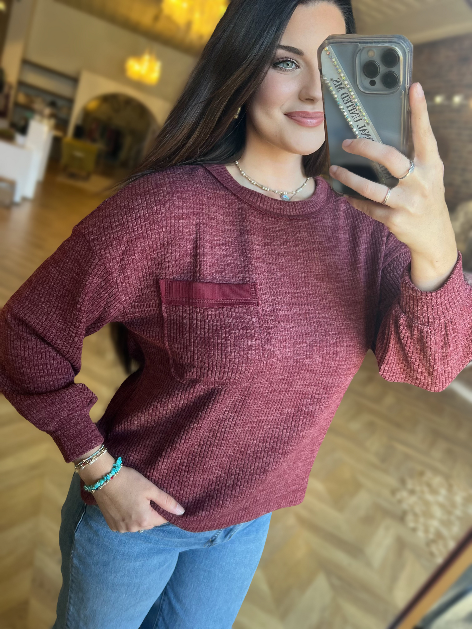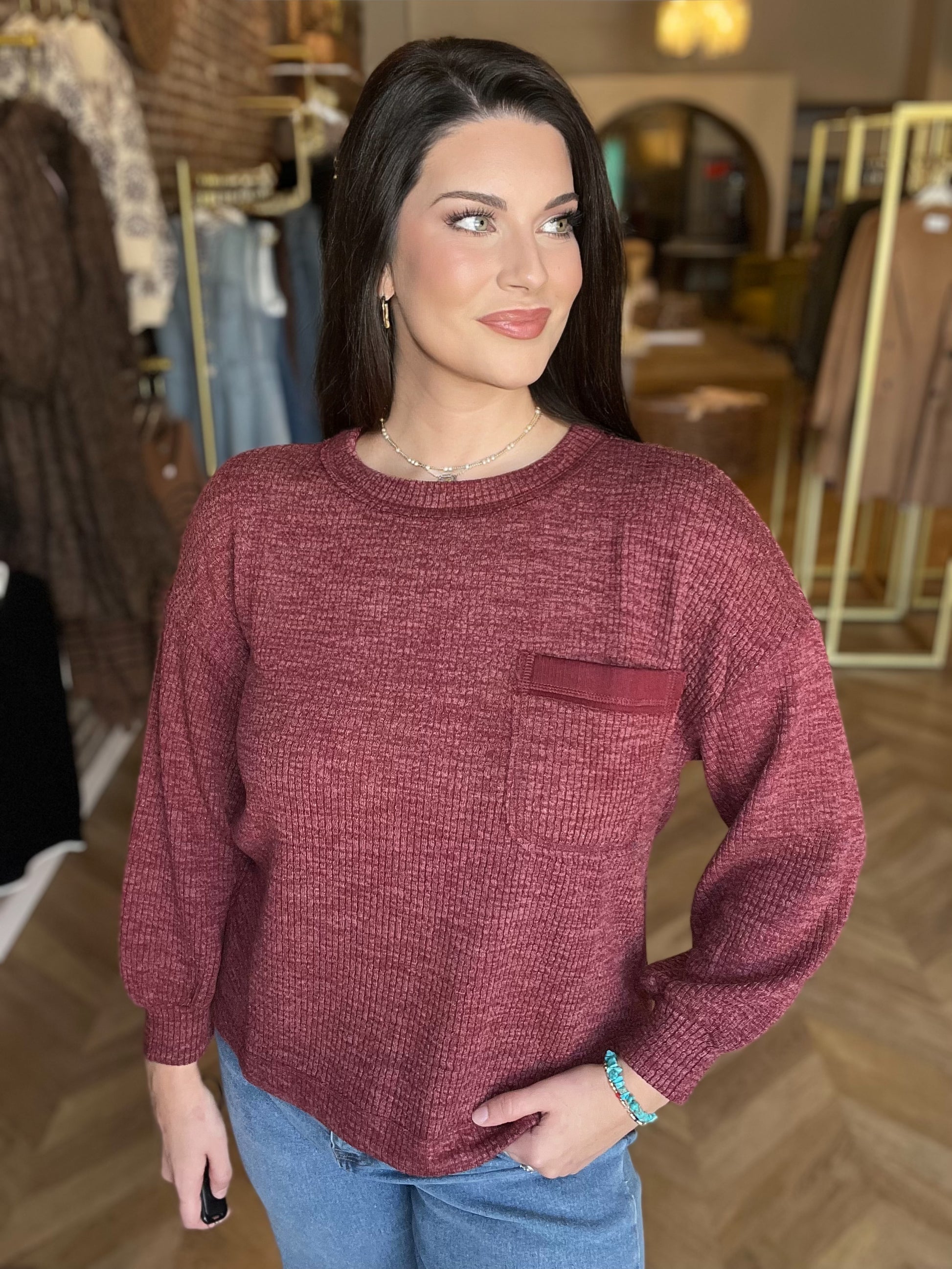 ROUND NECK CREW NECKLINE LONG SLEEVES DROP SHOULDER POCKET DETAIL RELAXED FIT SOLID NOT LINED KNIT TOP