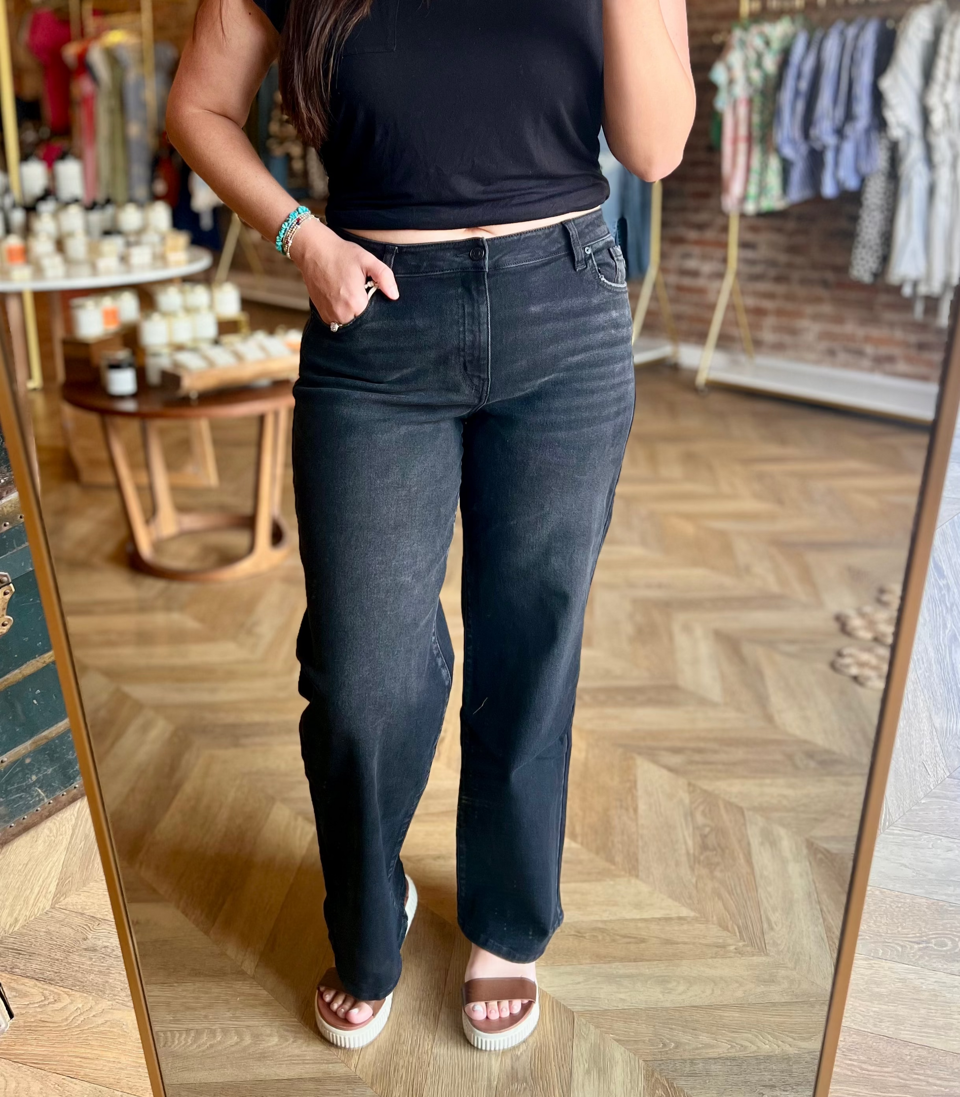 HIGH RISE WIDE LEG JEANS BLACK WASH STRETCH NON DISTRESSED REGULAR HEM 5 POCKET STYLE ZIPPER FLY FRONT
