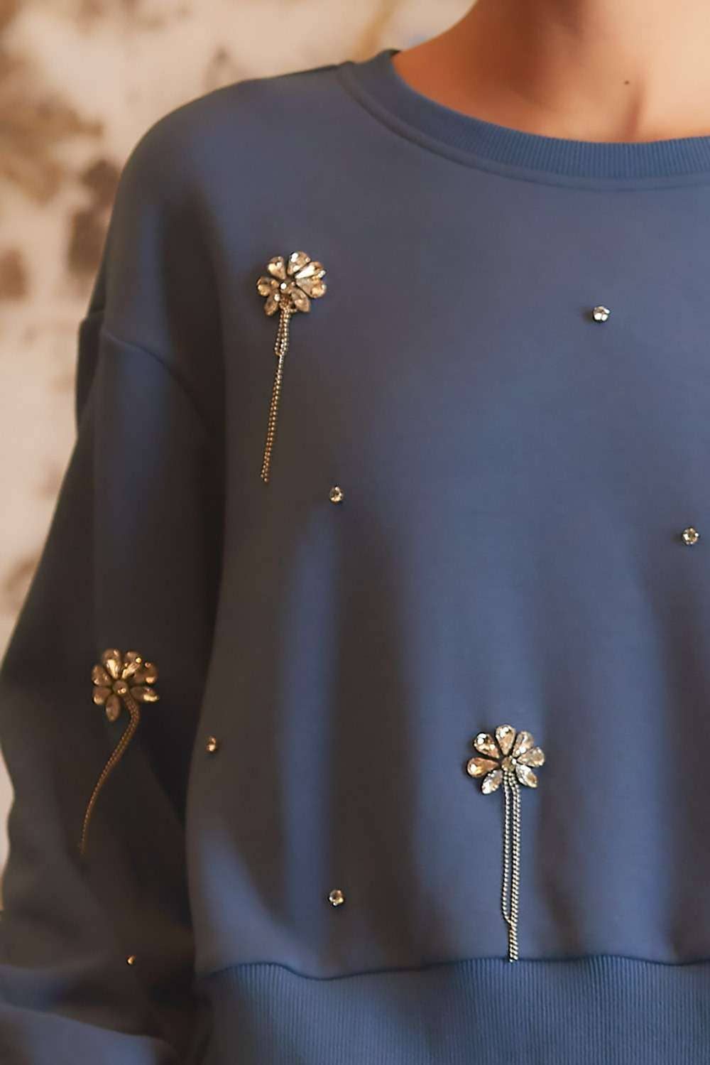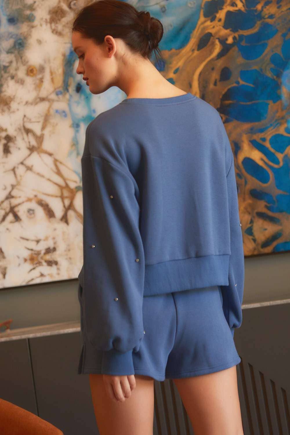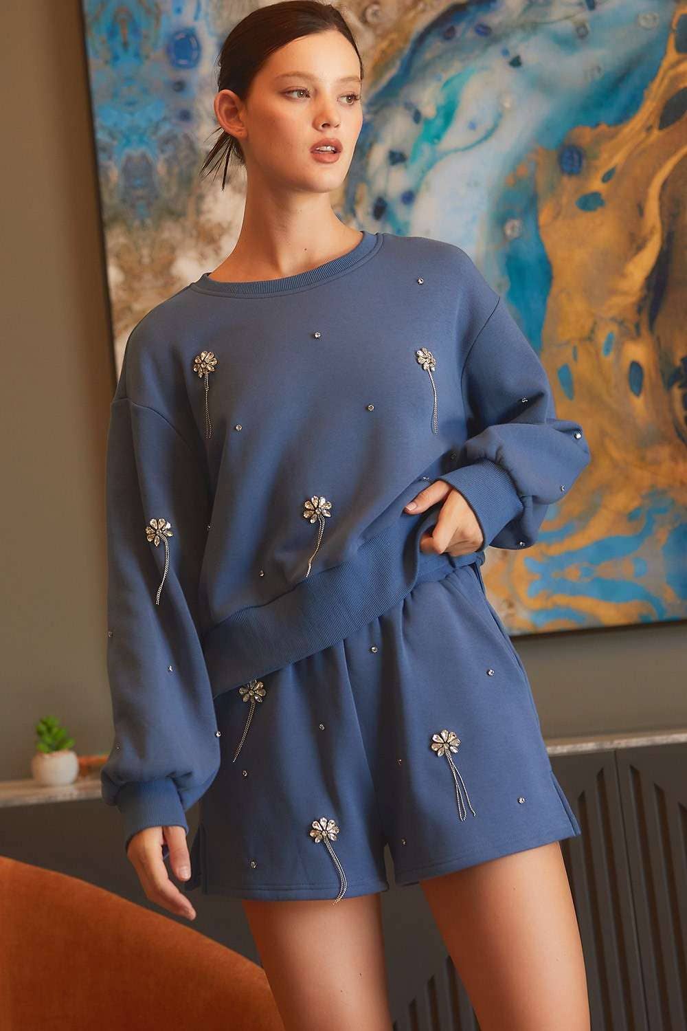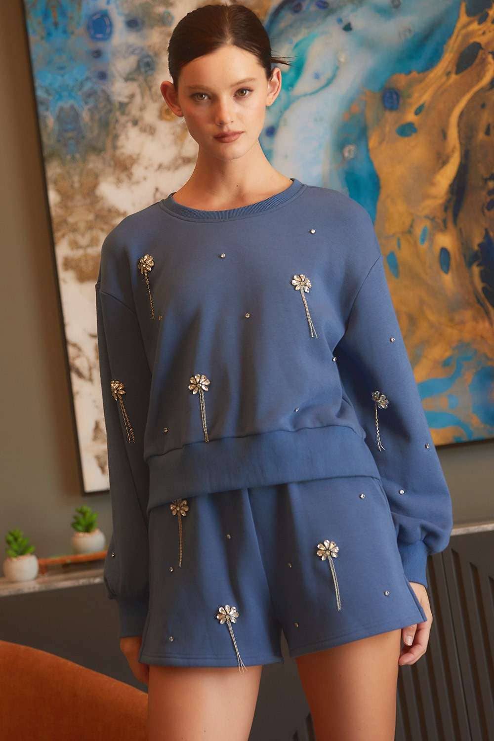 Who says comfy can’t be glamorous? This two-piece lounge set takes cozy to the next level with dazzling rhinestone and pearl embellishments throughout. The soft, lightweight sweatshirt features balloon sleeves and a relaxed fit, while the matching high-rise shorts offer a comfy elastic waistband and a flattering silhouette. The sparkling flower appliqués add a fun, fashion-forward twist that’s perfect for travel, girls’ nights, or just leveling up your loungewear game. In sizes XS-XL