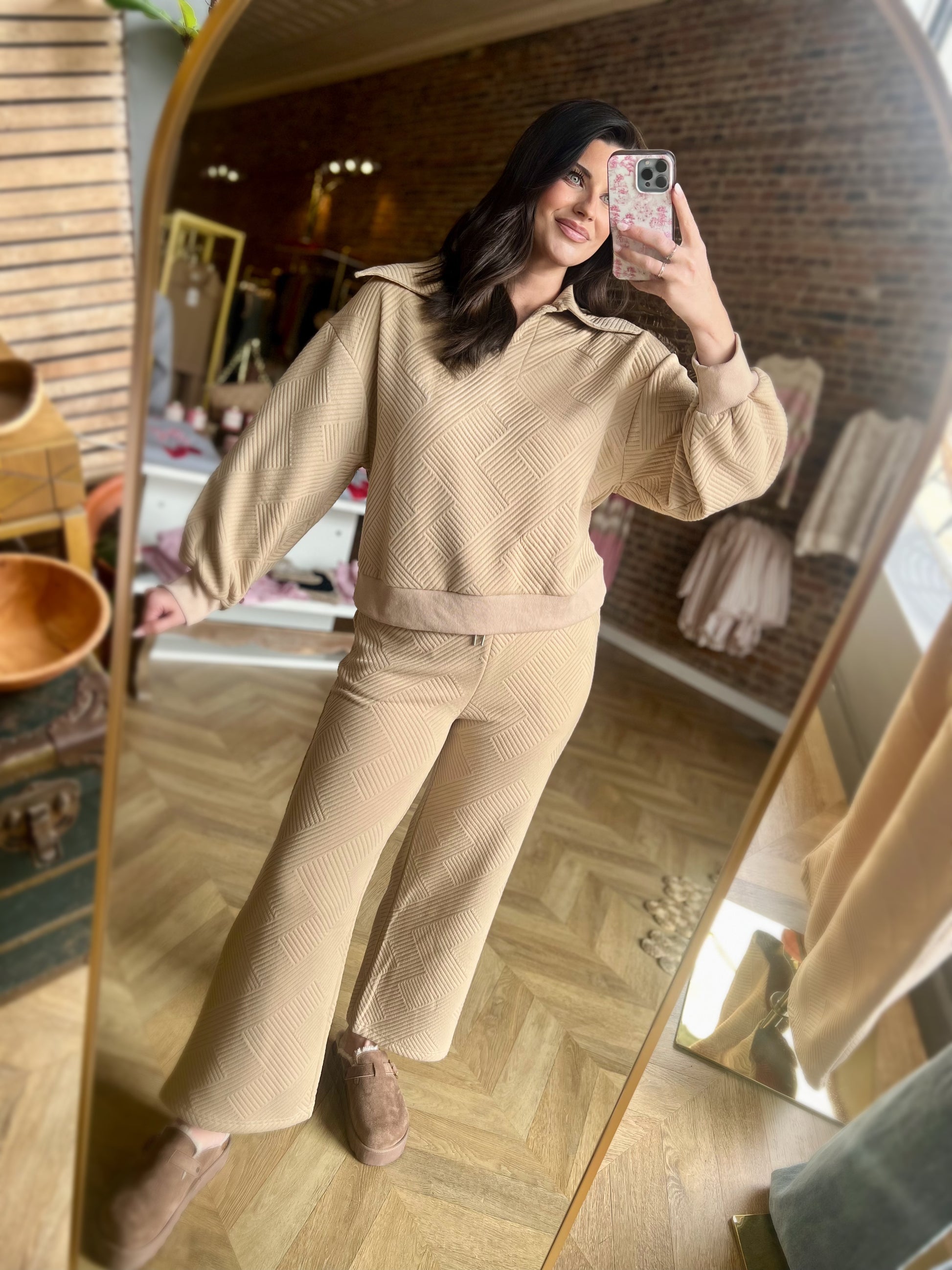 - Textured Knit Casual Comfy Top & Pants Set TOP - Oversized - Collared - Drop Shoulder - Long Sleeve BOTTOM - Elastic Waist W/ Drawstring - Wide Leg - Side Pockets (Model height: 5"10", wearing a Small)