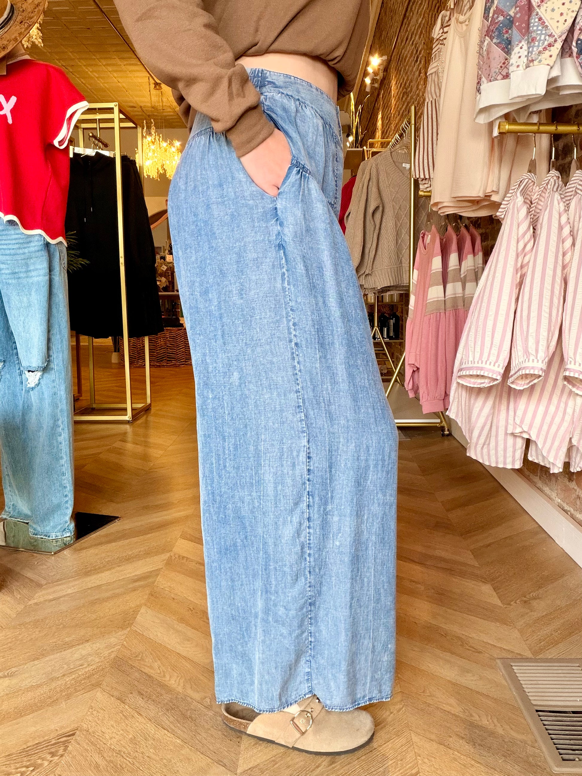 - Mineral Washed Chambray Wide Pants - Front Button Detail W/ Shirring - Side Pockets - Back Elastic Waist 100% TENCEL