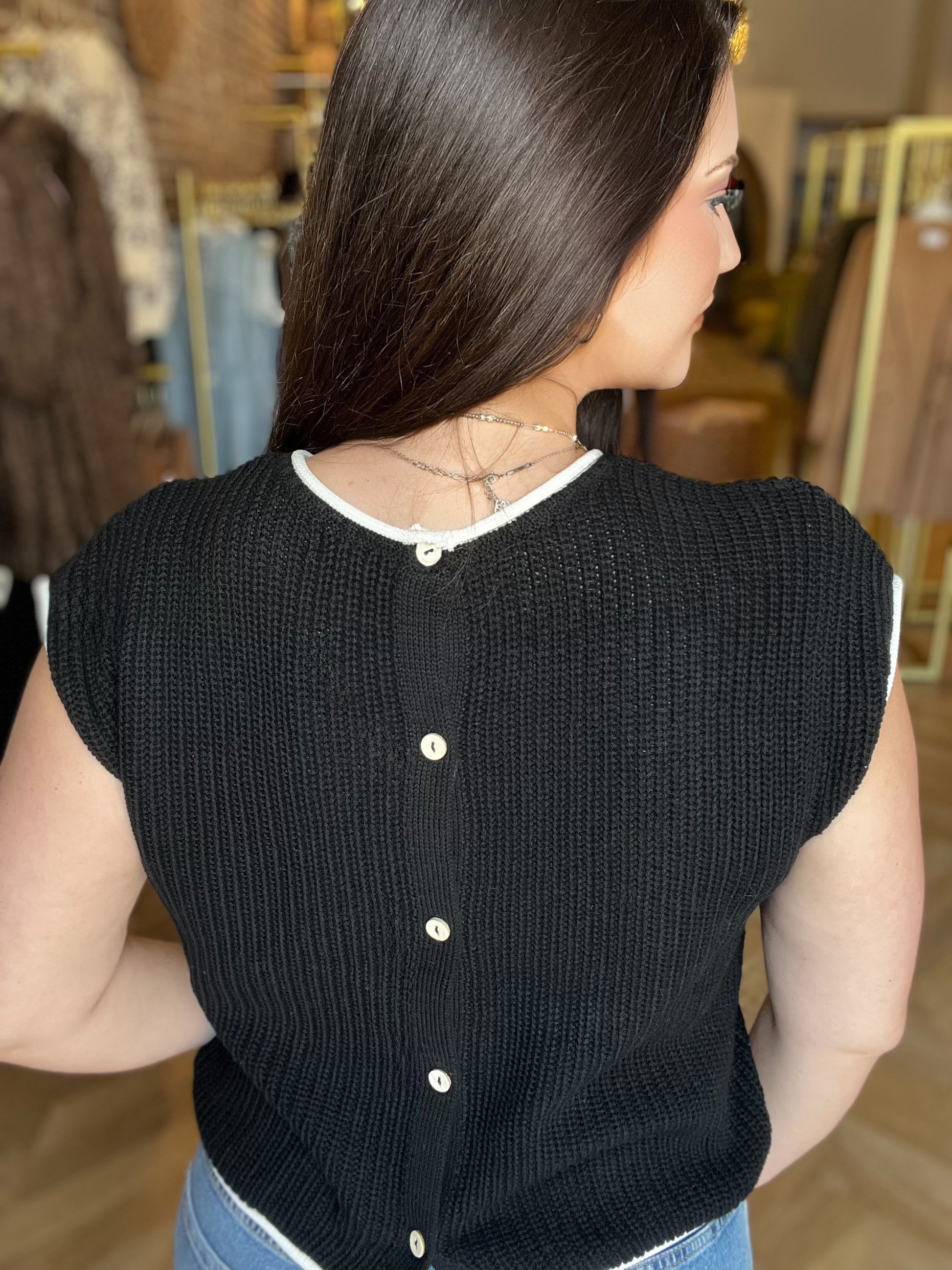 BOAT NECKLINE SHORT SLEEVES CONTRAST TRIM BACK NON-FUNCTIONAL BUTTON SWEATER KNIT SWEATER TOP CONTRAST