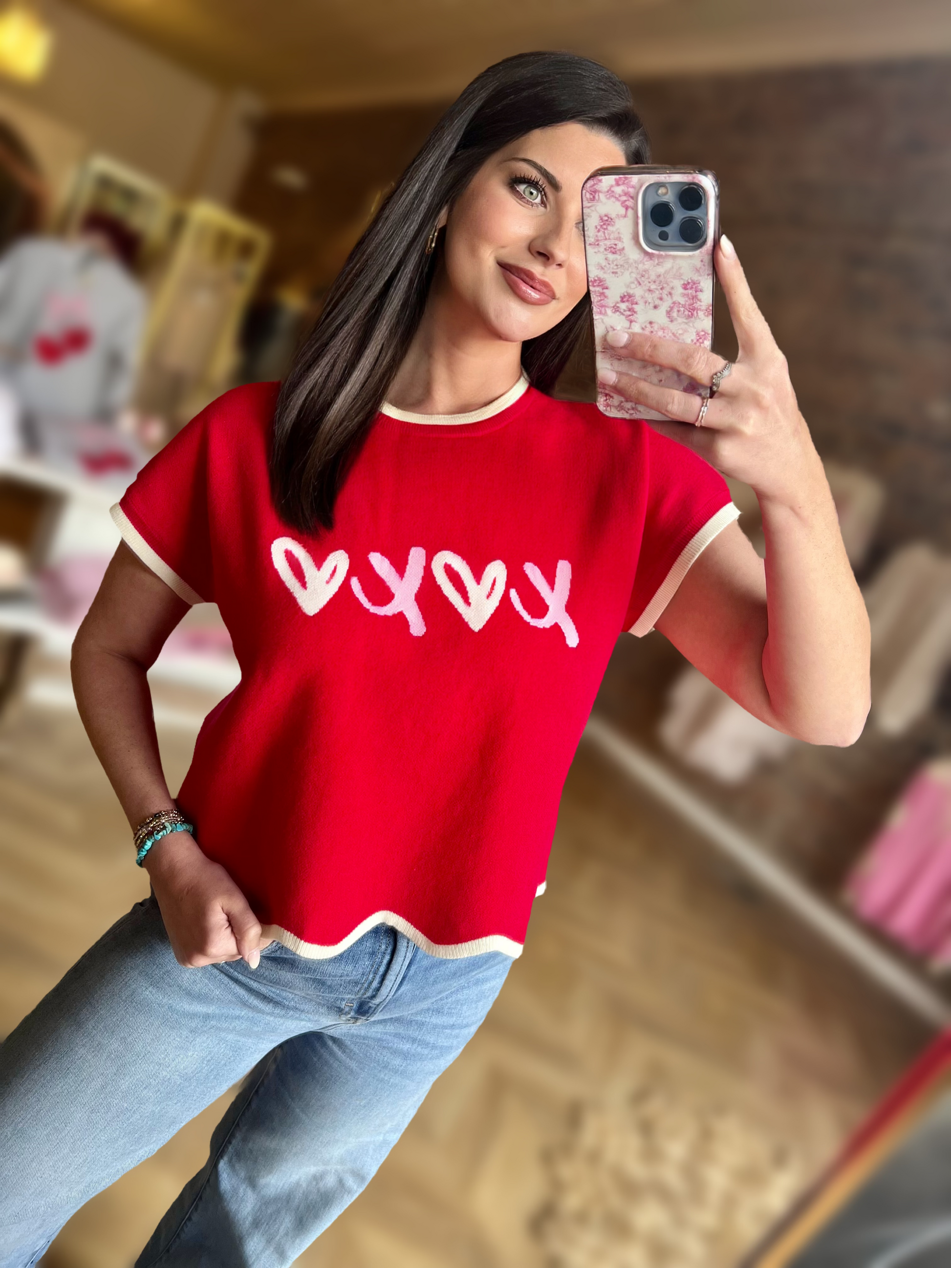 DROP SHORT SLEEVE SCALLOP HEM XOXO KNIT SWEATER TOP WITH CONTRAST EDGE